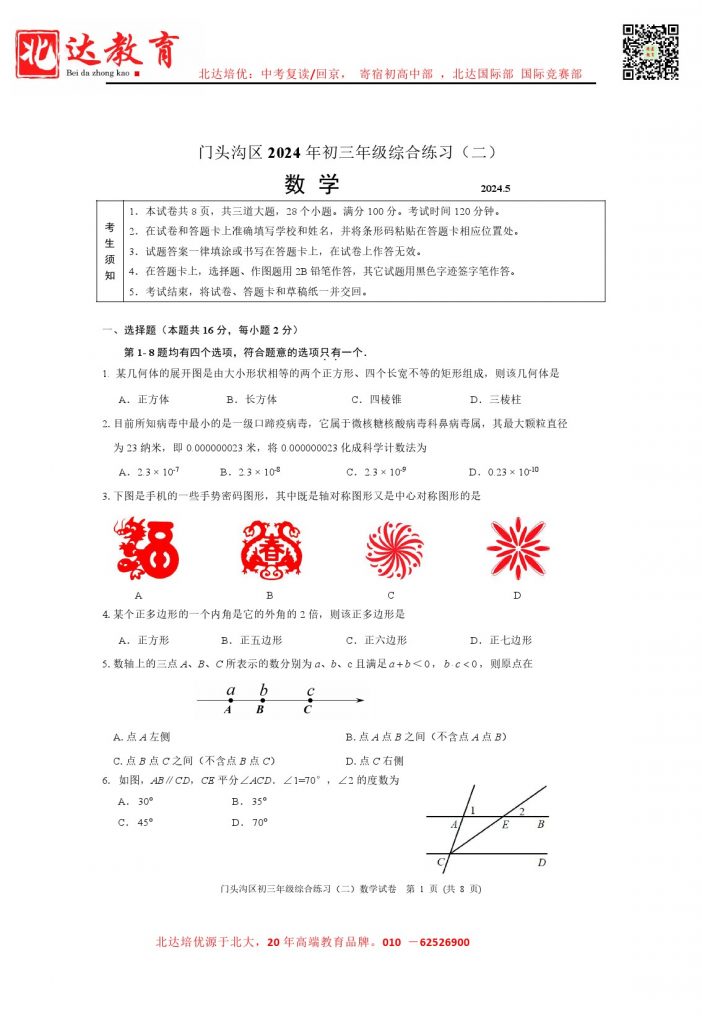 2024北京门头沟区初三二模数学试卷及答案