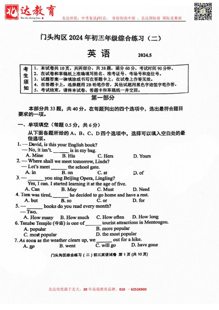 北京门头沟区2024初三二模英语试卷及答案
