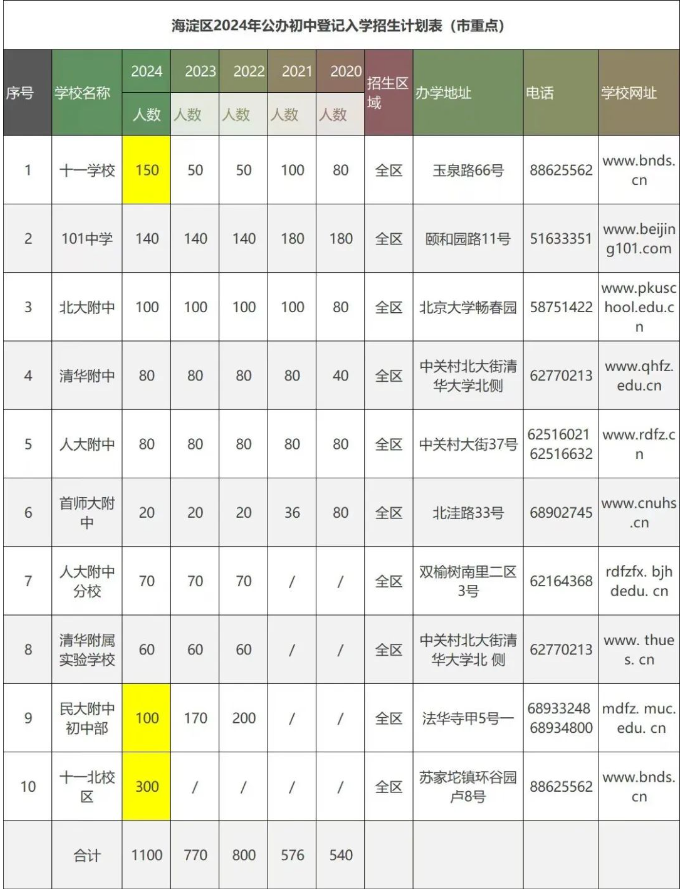 海淀区2024年公办初中初中派位表一派名额十一学校由50个增加得到150人,比去年增加一百人。十一北校区全部一派摇号总计摇号300人。民大附中由170人减少到100人,自行招生空间增加.其他六强名额没有变动。