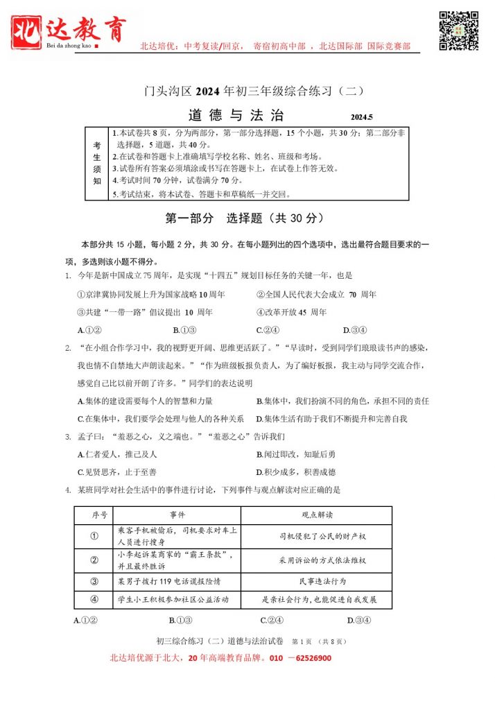 admw360中考教研组收集整理了北京门头沟区2024初三二模物理试卷及答案,快来看看你答的如何吧。