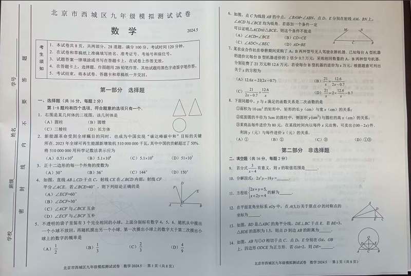 2024北京西城区初三二模数学试题及答案
