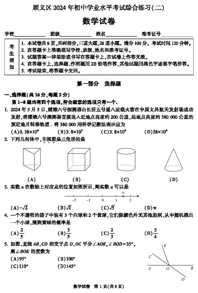 首页 初三试题 2024北京顺义区初三二模数学试题及答案