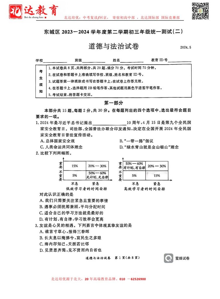 admw360中考教研组收集整理了2024北京东城区初三二模物理试题及答案,快来看看你答的如何吧。