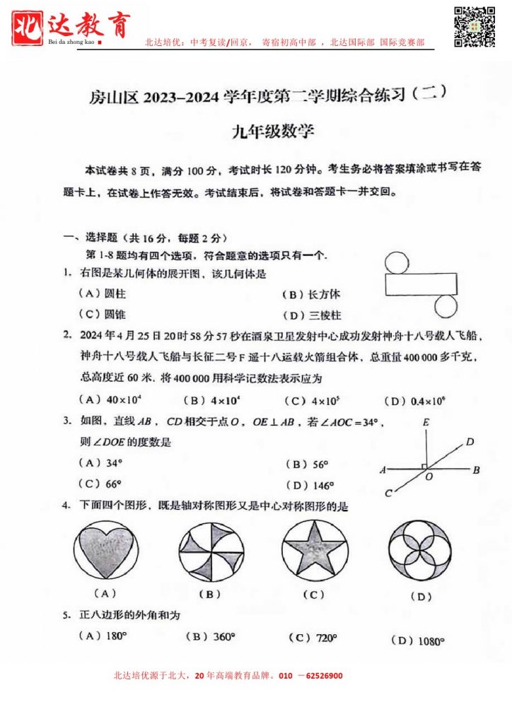 admw360中考教研组收集整理了2024北京房山区初三二模数学试题及答案,快来看看你答的如何吧。