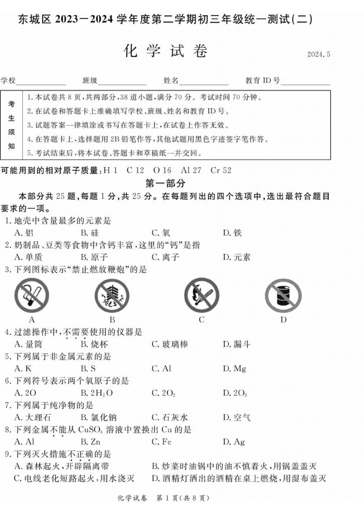 2024北京东城区初三二模化学试题及答案