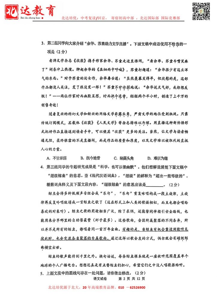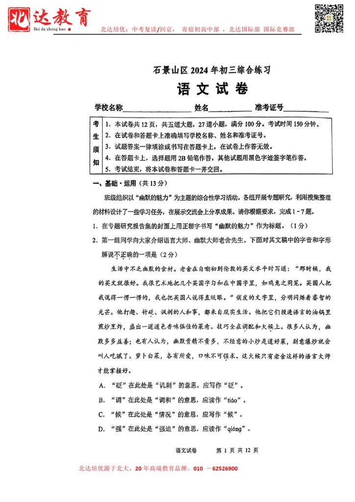 admw360中考教研组收集整理了2024北京石景山区初三二模语文试题及答案,快来看看你答的如何吧。