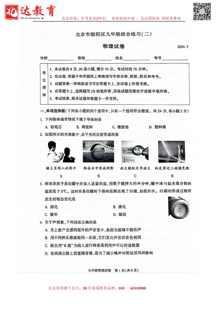 admw360中考教研组收集整理了2024北京朝阳区初三二模物理试题及答案,快来看看你答的如何吧。
