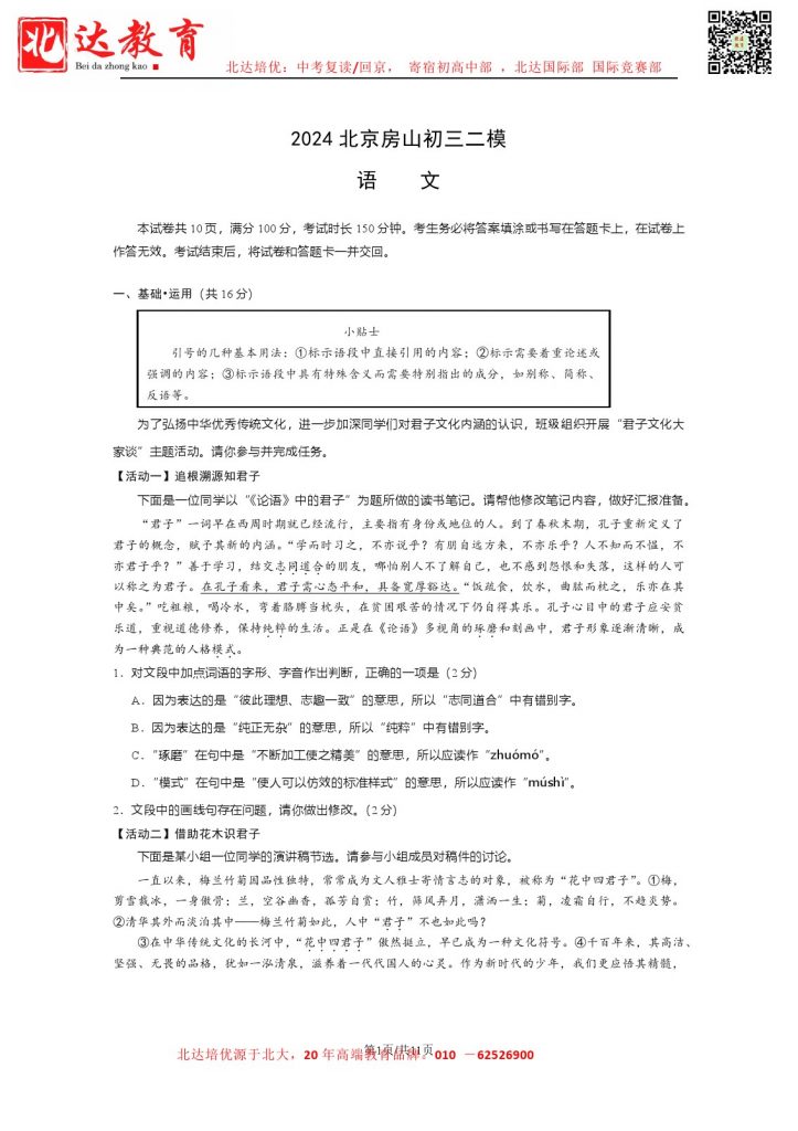 admw360中考教研组收集整理了2024北京房山区初三二模语文试题及答案,快来看看你答的如何吧。