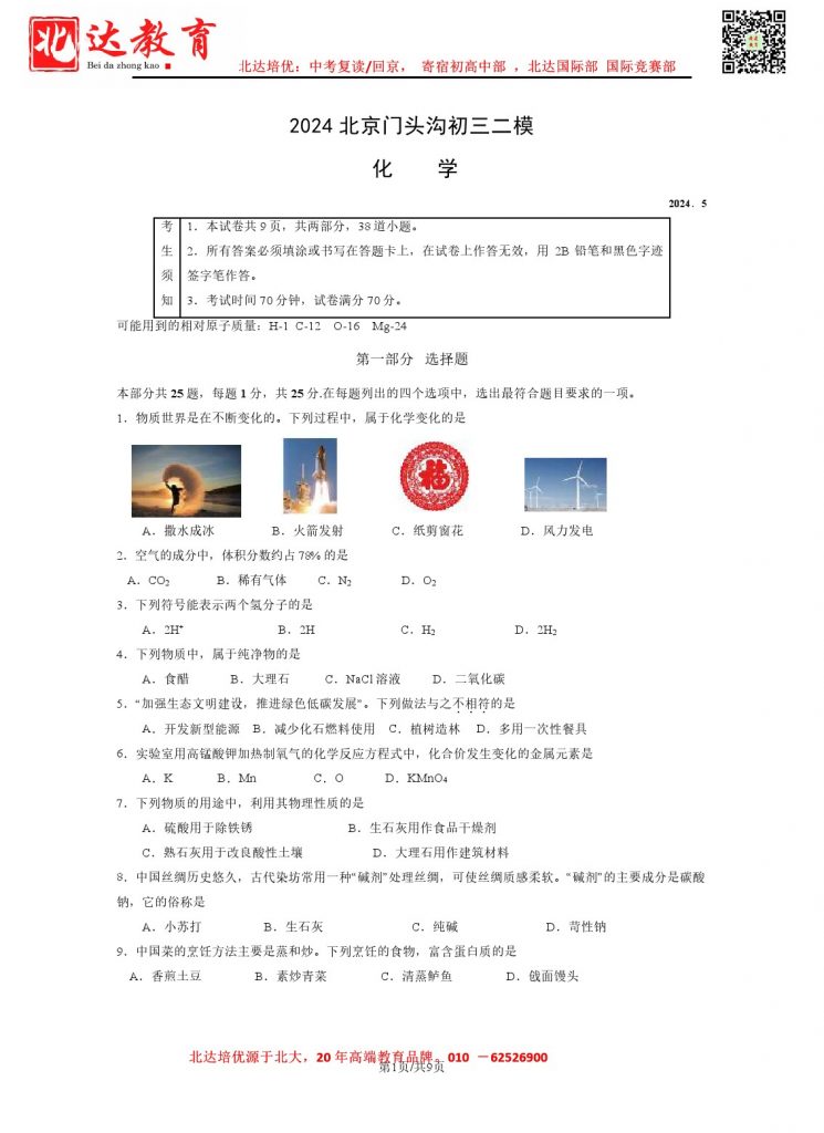 admw360中考教研组收集整理了北京门头沟区2024初三二模化学试卷及答案,快来看看你答的如何吧。