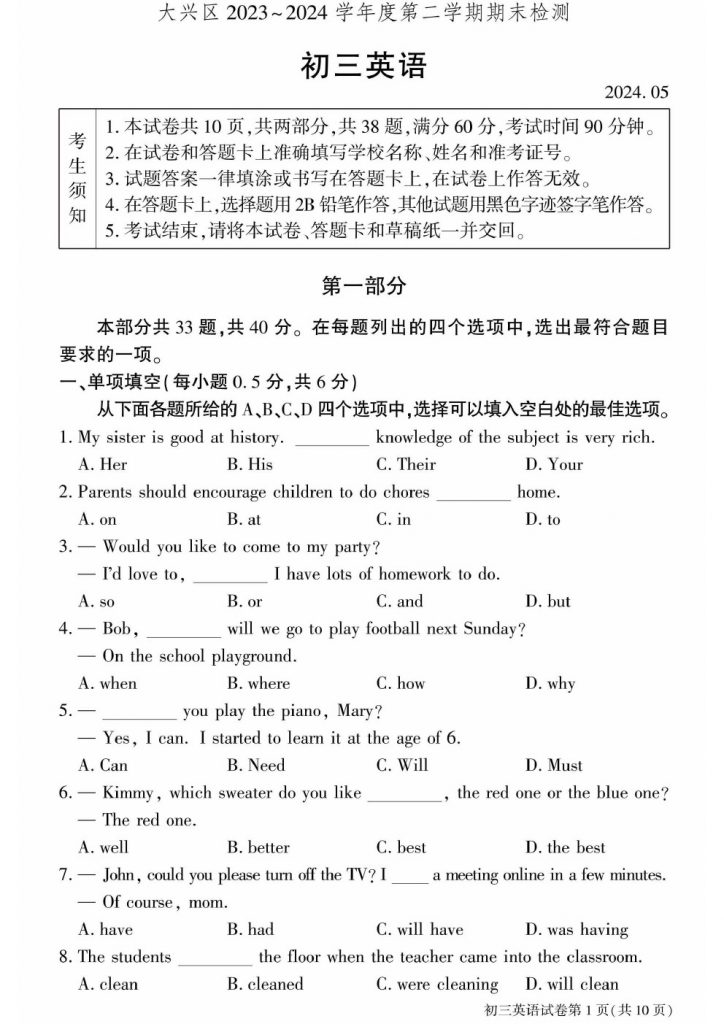 admw360中考教研组收集整理了2024北京大兴区初三二模英语试题及答案,快来看看你答的如何吧。 相关阅读: 历年北京中考真题及答案 历年北京初三二模试题及答案汇总 2024年北京各区初三…
