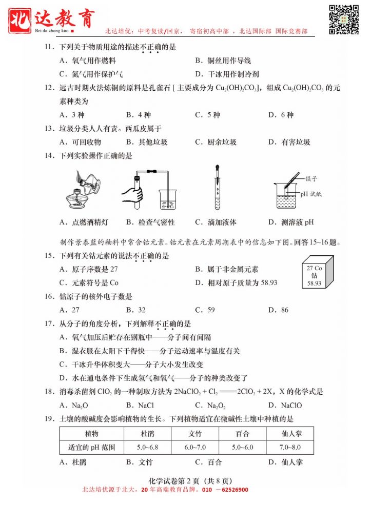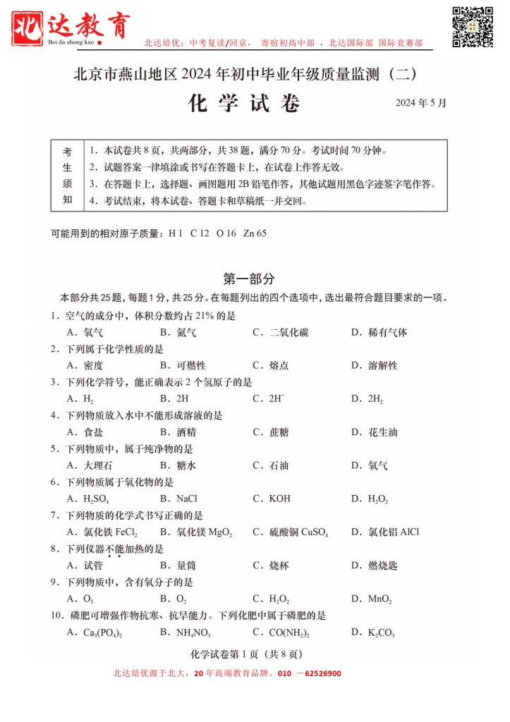 admw360中考教研组收集整理了2024北京燕山区初三二模化学试题及答案,快来看看你答的如何吧。
