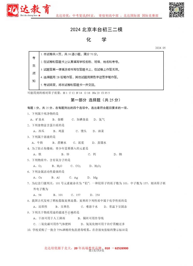 admw360中考教研组收集整理了2024北京丰台区初三二模化学试题及答案,快来看看你答的如何吧。