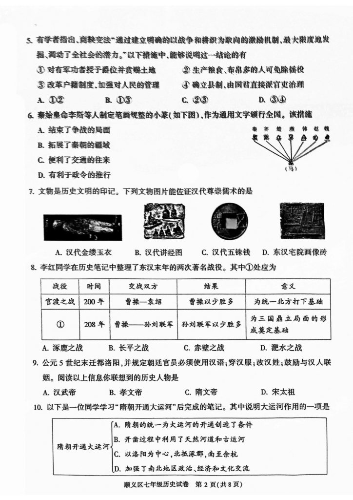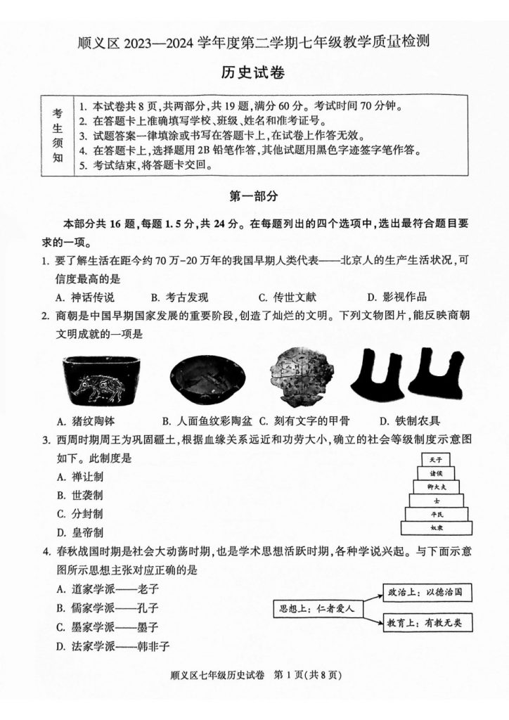 首页 初一试题 2024北京顺义区初一(下)期末历史试题及答案