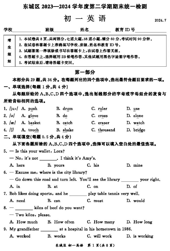 2024北京东城区初一下期末考试已开始,小编为大家收集整理了相关科目的试卷,需要的同学可自行下载。