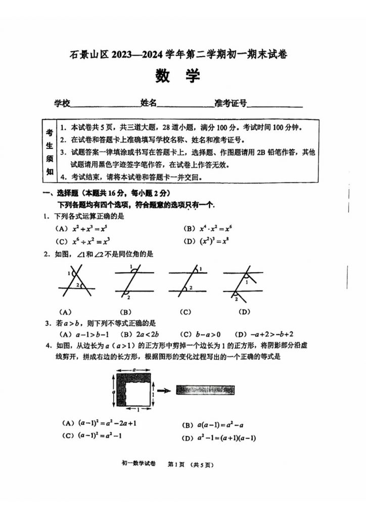 2024北京石景山区初一下期末考试已开始,小编为大家收集整理了相关科目的试卷,需要的同学可自行下载。