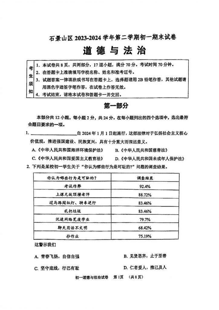 2024北京石景山区初一下期末考试已开始,小编为大家收集整理了相关科目的试卷,需要的同学可自行下载。