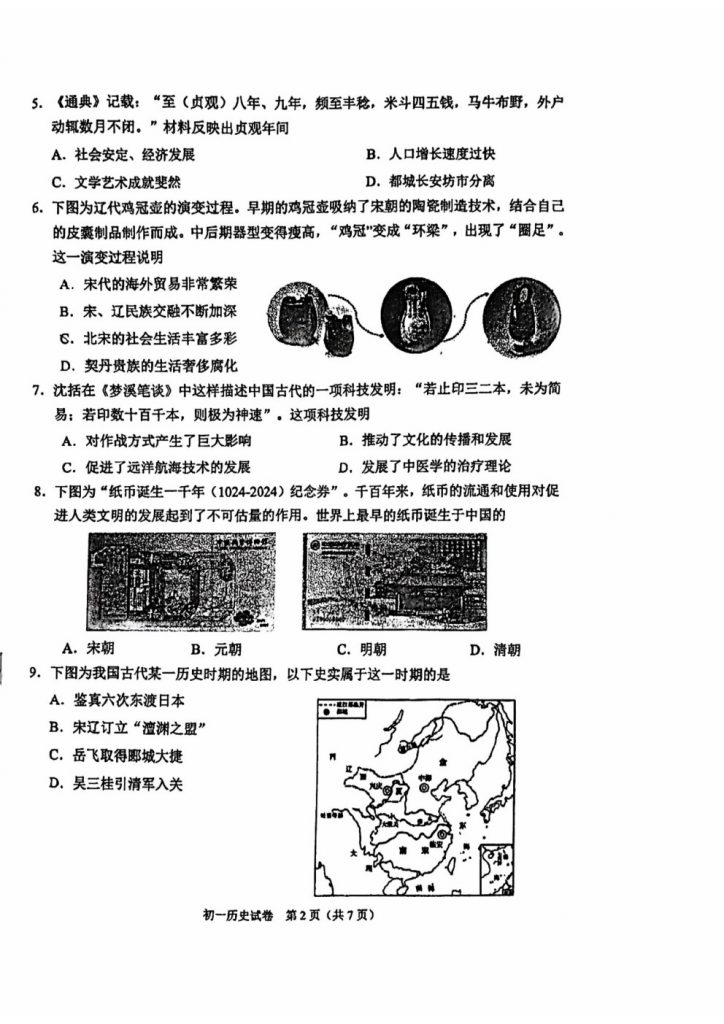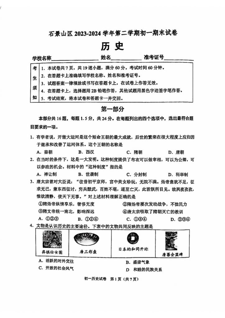 首页 初一试题 2024北京石景山区初一(下)期末历史试题及答案