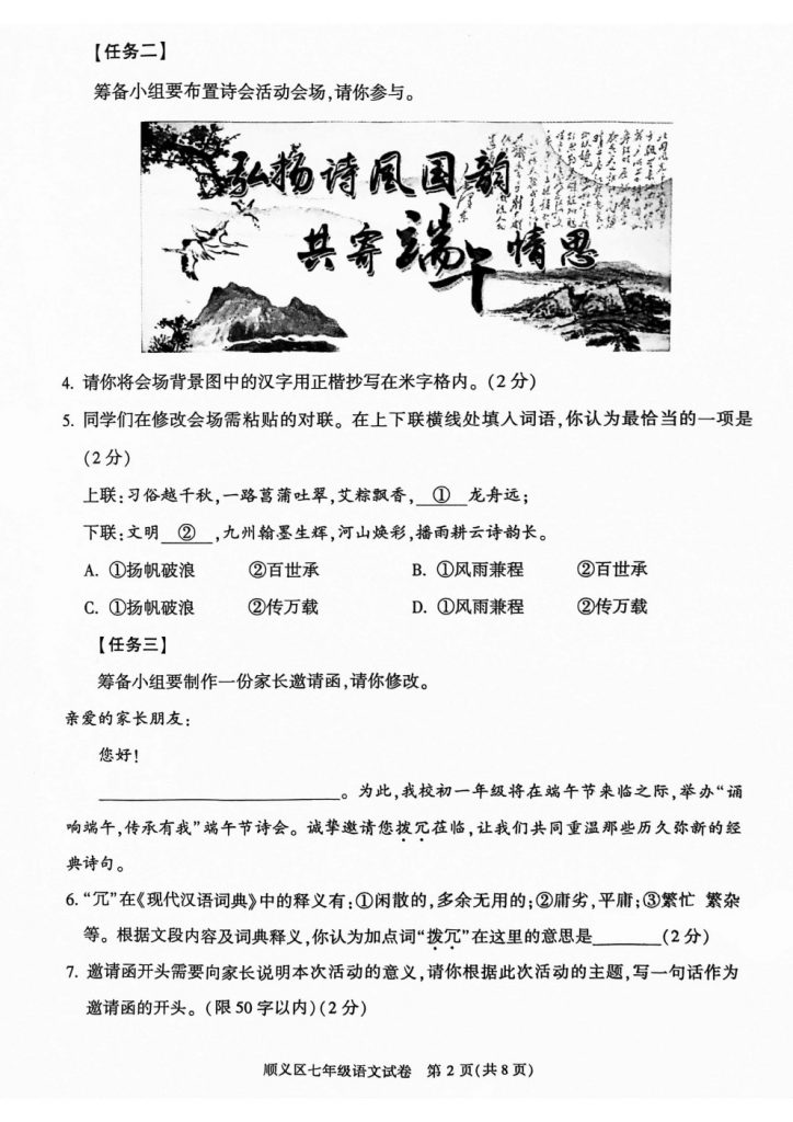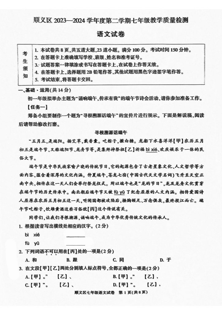 首页 初一试题 2024北京顺义区初一(下)期末语文试卷及答案