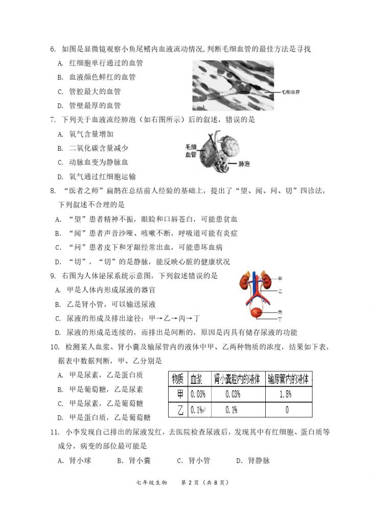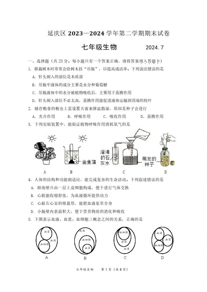 首页 初一试题 2024北京延庆区初一(下)期末生物试卷及答案