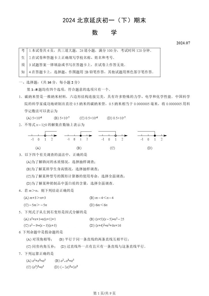 2024北京延庆区初一下期末考试已开始,小编为大家收集整理了相关科目的试卷,需要的同学可自行下载。