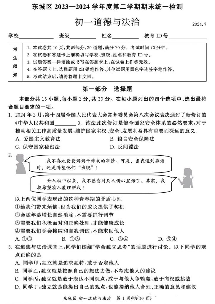 2024北京东城区初一下期末考试已开始,小编为大家收集整理了相关科目的试卷,需要的同学可自行下载。