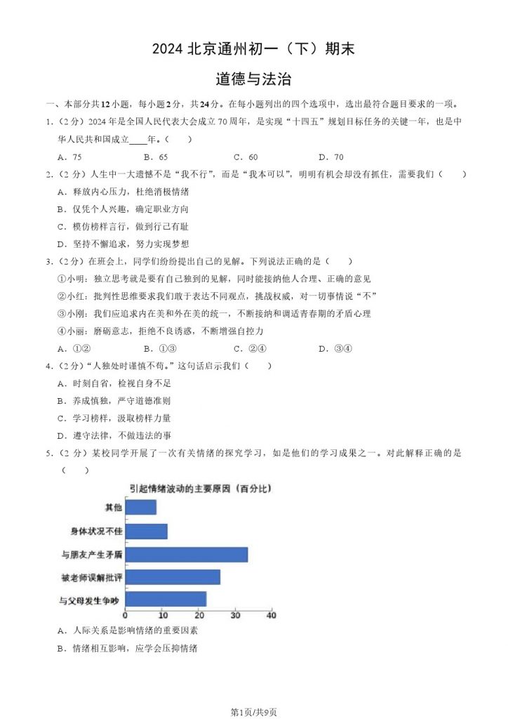 首页 初一试题 2024北京通州区初一(下)期末道法试卷及答案
