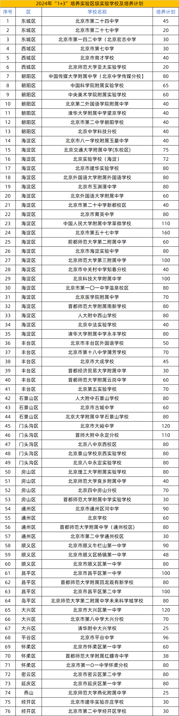 2024年北京市“1+3”培养实验项目计划招生6014人,相比2023年的3144人,增加了2870个名额。同时,实验学校数量的显著增加,从去年的41所增加到今年的82所。下图是具体培养计划: