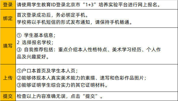 报名工作主要通过北京市“1+3”培养实验平台(https://yjs.bjedu.cn)进行。学生需使用个人教育ID登录该平台,并按照要求填写相关报名信息。在报名过程中,学生需重点介绍自己的性格特点、美术学习经历以及个人作品等,以便学校全面了解学生的综合素质和艺术潜力。