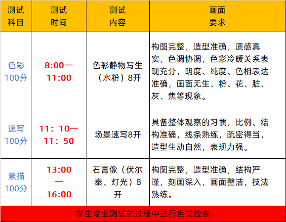 参加专业测试的学生需自行准备画板、画纸等绘画工具,并可根据需要携带铅笔、彩铅、马克笔等绘画材料。如需使用画架,请自备便捷式可伸缩折叠画架。测试结束后,学生可通过学校指定渠道查询自己的成绩及录取情况。