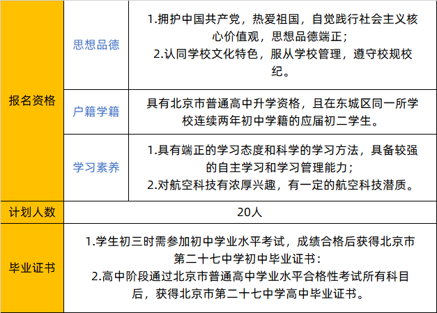 本次“1+3”航空科技创新实验班面向具有北京市普通高中升学资格,且在东城区同一所学校连续两年初中学籍的应届初二学生招生。报名学生需拥护中国共产党,热爱祖国,具备良好的思想品德与学习素养,对航空科技有浓厚兴趣及一定潜质。具体报名事宜如下图: