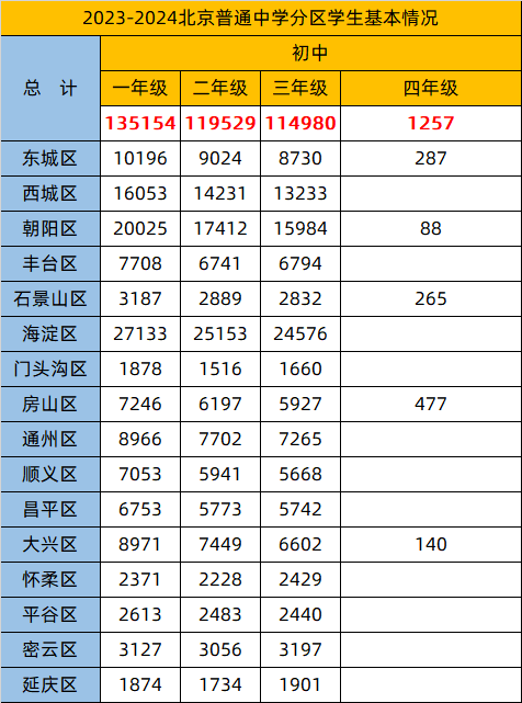 - 值得注意的是,部分区域(如西城区、丰台区、石景山区等)的初四年级学生数据缺失,这可能与区域教育政策、学校设置或统计口径等因素有关。