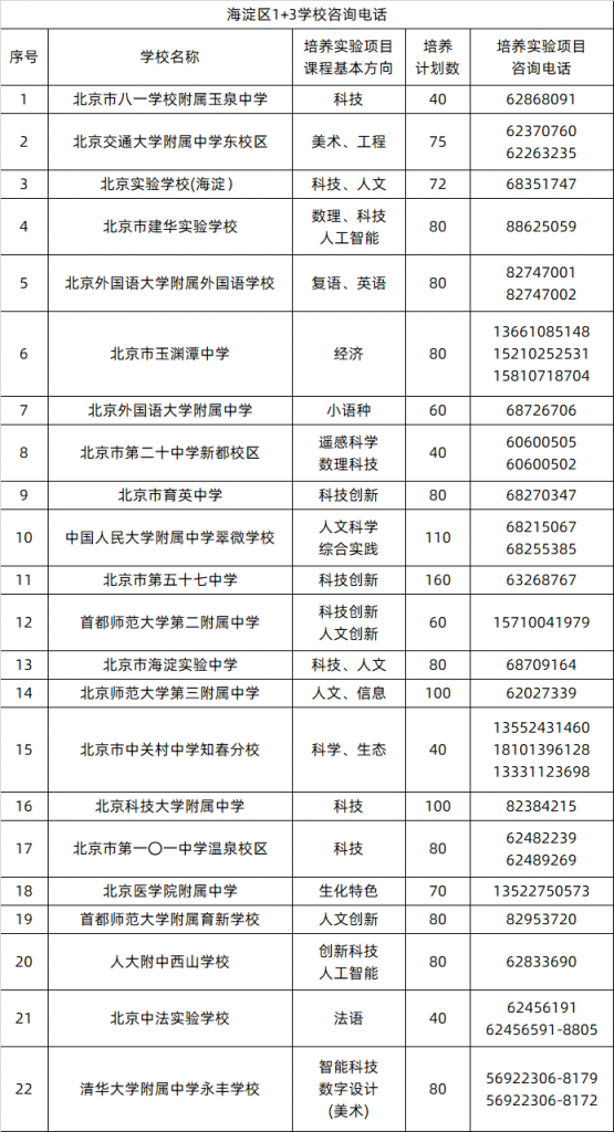 为了让广大学生和家长更便捷地了解各学校的联系方式及培养实验项目,小编特别整理了这份海淀区1+3学校全面指南。