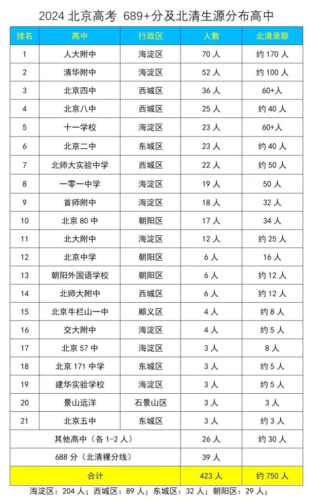 北清裸分线是688,上面的数据是689的人数,689分是一共384人;688分还有39人,一共是423人。从数据上来看,六小强五金刚几乎形成了垄断,其他学校也是各区数一数二的学校了!