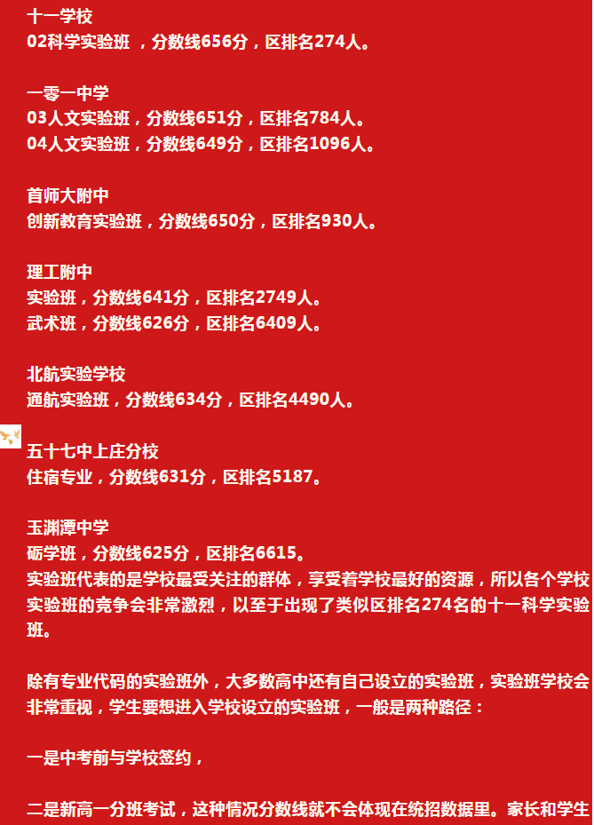 北京义务教育阶段学校不允许设置实验班,但是到高中学校就可以设置实验班了,一些学校的实验班有专业代码,学生可以在填志愿时报考。整理了24年海淀部分学校实验班分数线和区排名,供大家参考。