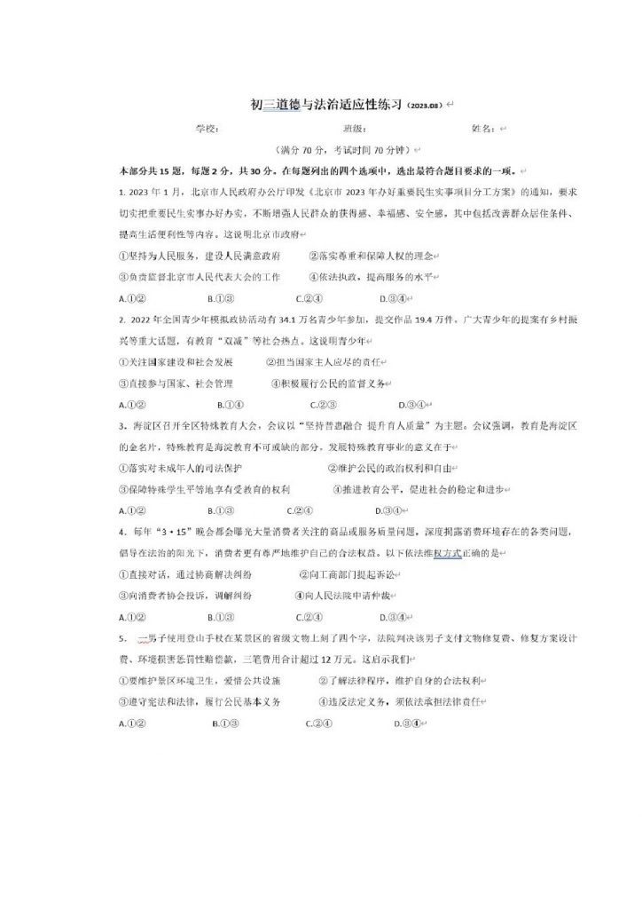 2024年北京初三即将开学,小编收集到了2023北京清华附中初三上道法开学考试题及答案,现与大家分享。需要的自信下载练习吧。
