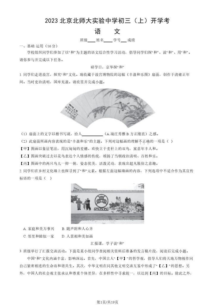 2024年北京初三即将开学,小编收集到了2023北师大实验中学初三上语文开学考试题及答案,现与大家分享。需要的自信下载练习吧。
