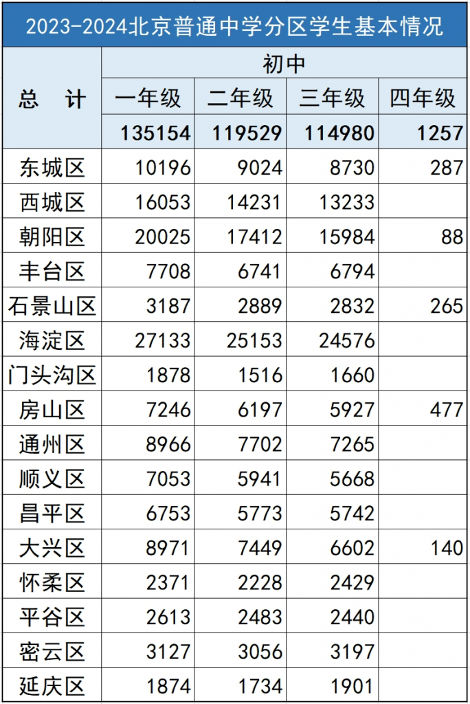 据北京市教委发布的《2023-2024学年度北京教育事业发展统计概况》显示,北京初中在校生呈现逐年增加的趋势,今年初三在校生有11余万人,明年毕业生逼近12万,预计将比今年增加4549人,后年则超过13万。