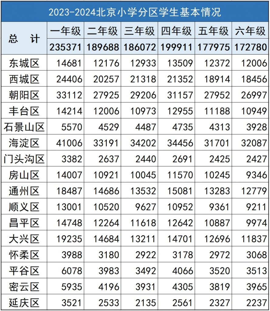 现阶段北京16区六年级在校生为172780人,去年为146014人,增加了26766人。对比小学各个年级的人数,可以看到学生人数整体仍在高位增长态势。