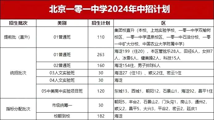 ②2024年一零一中学升学途径有校内/集团内直升、校额到校、统一招生、市级统筹一,除了上述升学途径外,还可通过统招中国际班、国际校、特长生招生等途径考入一零一中学。需要注意的是,国际班、国际校需要将志愿填报在统招批次。