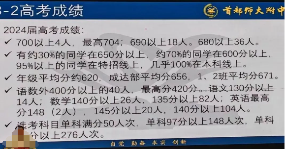 690分以上37人,位居北京第二,仅次于人大附;688分以上40人,686分以上46人,今年清北线预估在686分左右