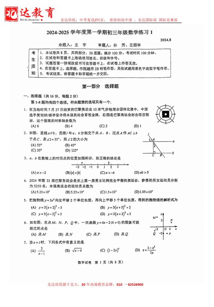 2024北京人大附中初三(上)开学考数学试题出炉,以下是小编为大家整理的相关内容,一起来看: