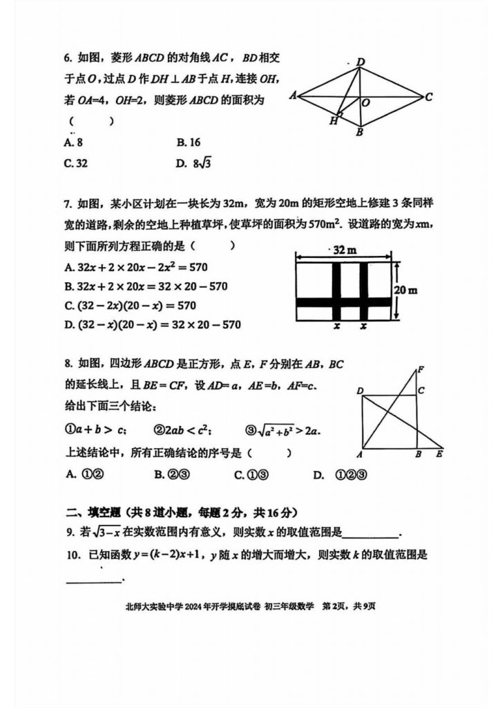 2024北京北师大实验中学初三(上)开学考数学试题出炉,以下是小编为大家整理的相关内容,一起来看: