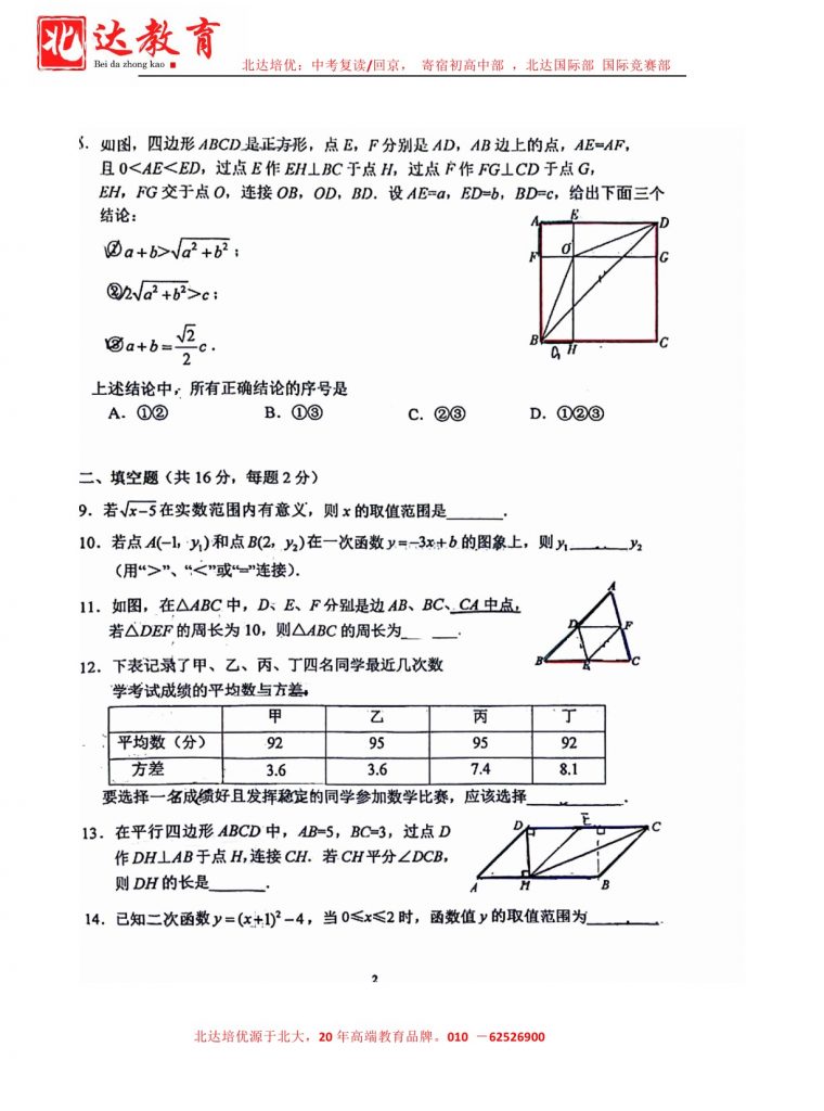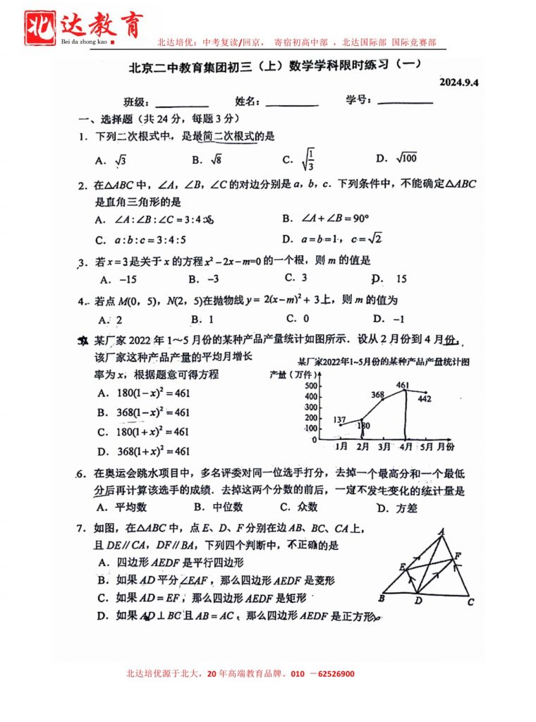 2024北京二中初三(上)开学考数学试题及答案出炉,以下是小编为大家整理的相关内容,一起来看: