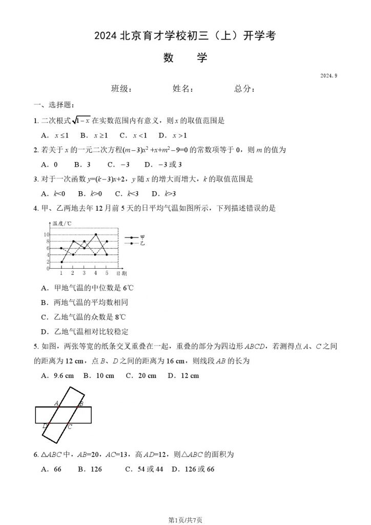 2024北京育才学校初三(上)开学考数学试题及答案出炉,以下是小编为大家整理的相关内容,一起来看: