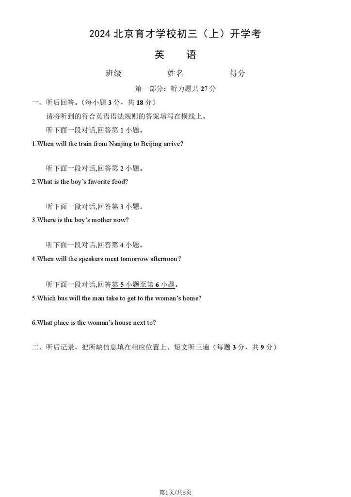 2024北京育才学校初三(上)开学考英语试题及答案出炉,以下是小编为大家整理的相关内容,一起来看: 试题下载:http://365.beijing518.com/11467.htm…