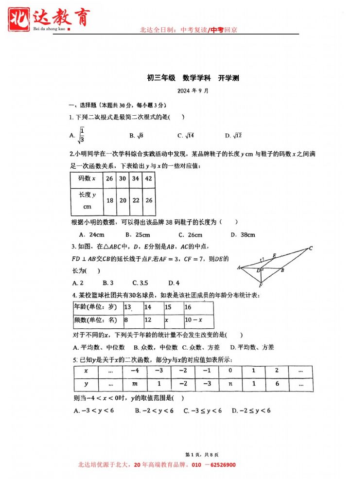 2024北京汇文中学初三(上)开学考数学试题出炉,以下是小编为大家整理的相关内容,一起来看: