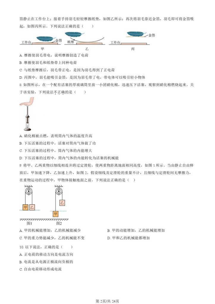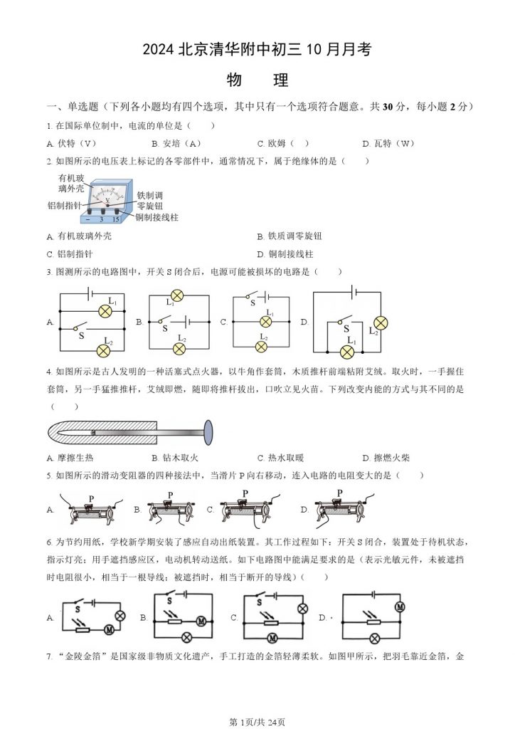 北京2024.10各个学校月考正在陆续进行中,为方便大家对答案、下载练习等小编给大家搜集了2024北京清华附中初三10月月考物理试题及答案,需要的小伙伴赶紧下载练习起来吧: