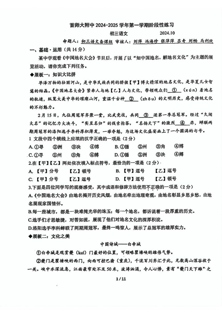 北京2024.10各个学校月考正在陆续进行中,为方便大家对答案、下载练习等小编给大家搜集了2024北京首都师大附中初三10月月考语文试题,需要的小伙伴赶紧下载练习起来吧:
