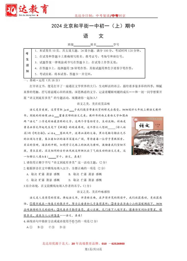 北京2024-2025学年期中考试正在陆续进行中,为方便大家对答案、下载练习等小编给大家搜集了2024北京和平街一中初一(上)期中语文试卷及答案,需要的小伙伴赶紧下载练习起来吧: …