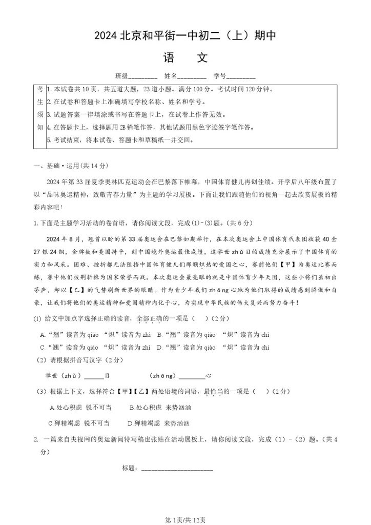 北京2024-2025学年期中考试正在陆续进行中,为方便大家对答案、下载练习等小编给大家搜集了2024北京和平街一中初二(上)期中语文试题及答案,需要的小伙伴赶紧下载练习起来吧: